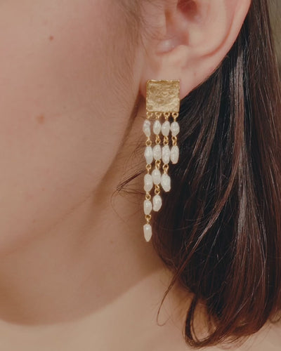 Kühn und elegant zugleich – unsere Sappho Ohrringe präsentieren eine Kaskade aus zarten Reiskornperlen, die an einem gehämmerten goldenen Quadrat hängen.