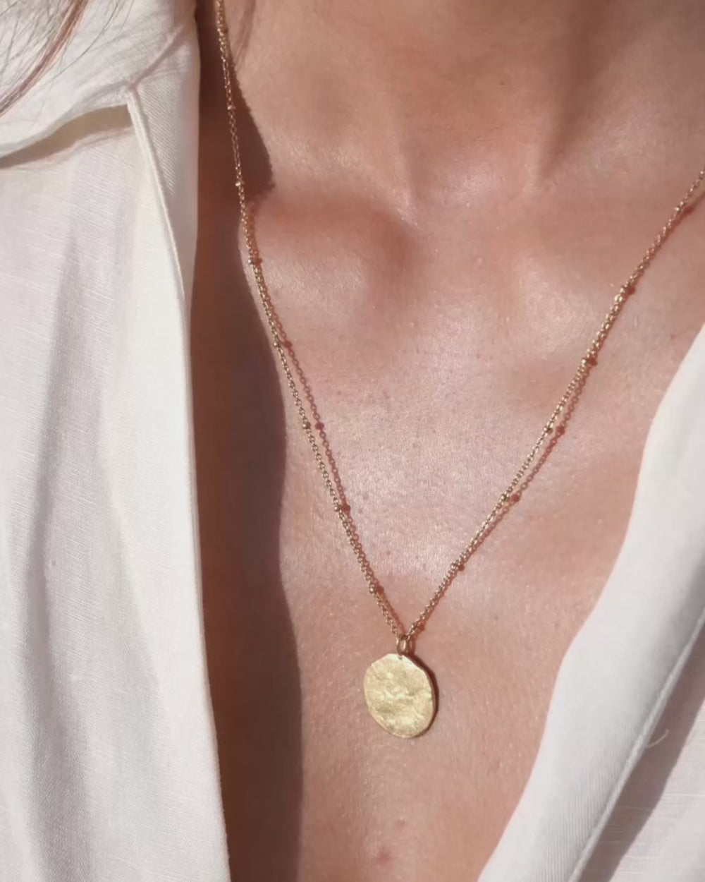 Minimalista y delicado, este collar se siente como un vestigio antiguo y precioso. Su diseño de luna llena martillada te protegerá día y noche. Combínalo con nuestros pendientes Luna para el look completo.