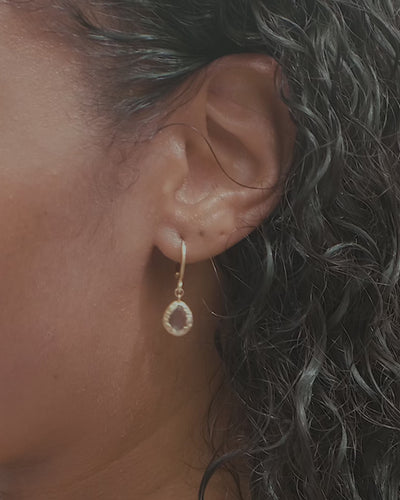 LysiaCrystalPendientes con colgantes en forma de gota, suspendidos de pequeñas criollas, cada uno adornado con una piedra blanca engastada a mano en oro texturizado.
