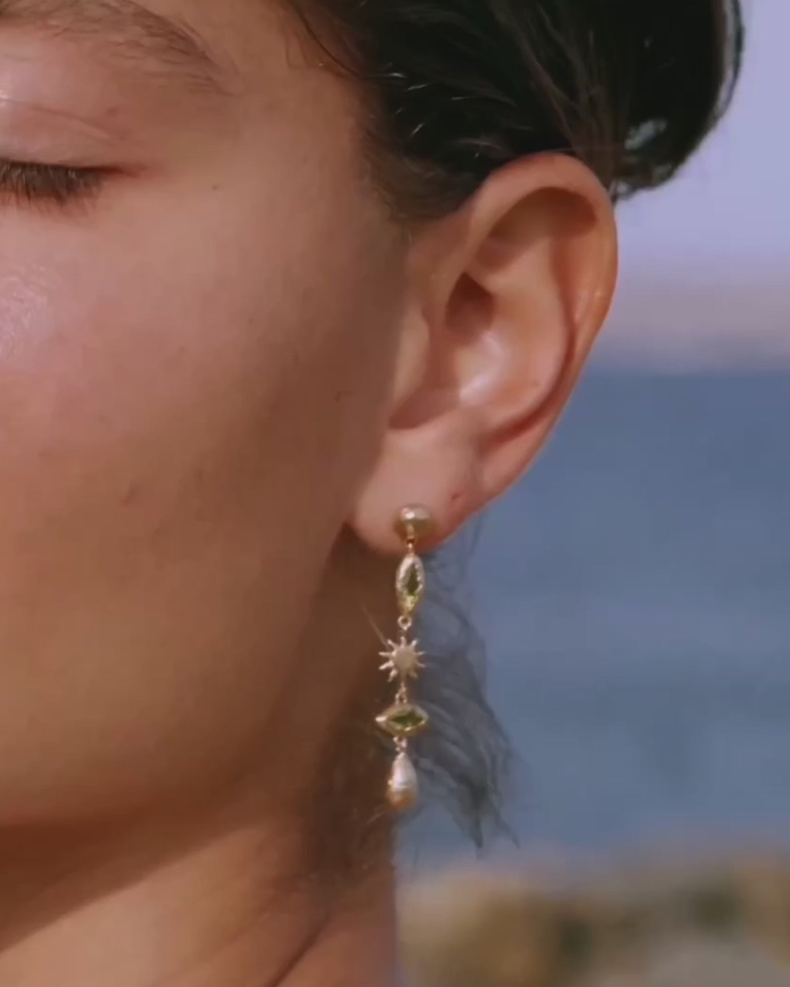 Les yeux de pierre verte de nos boucles d’oreilles pendantes Daphné apportent énergie, vitalité et chance.