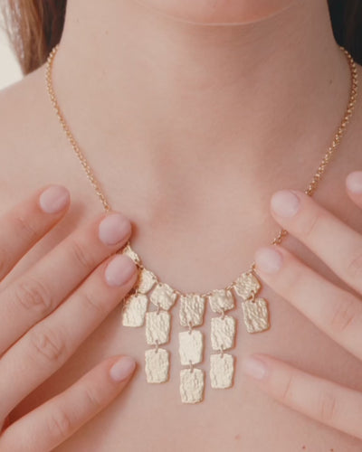 Una collana audace con una catena classica e un elemento centrale scultoreo. I suoi pannelli testurizzati e martellati sono disposti in una composizione a cascata su più livelli.