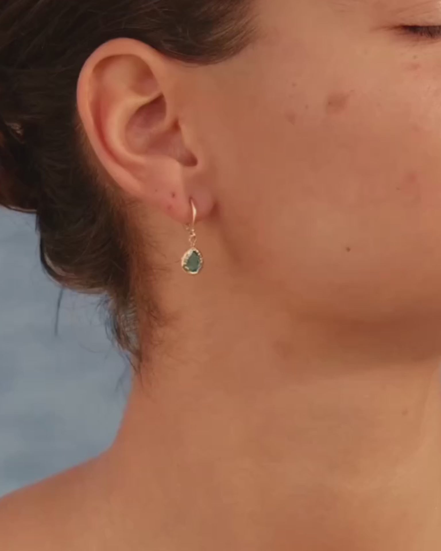 Orecchini con pendenti a forma di goccia, sospesi a piccole creole, ciascuno ornato da una pietra blu incastonata a mano in oro testurizzato.