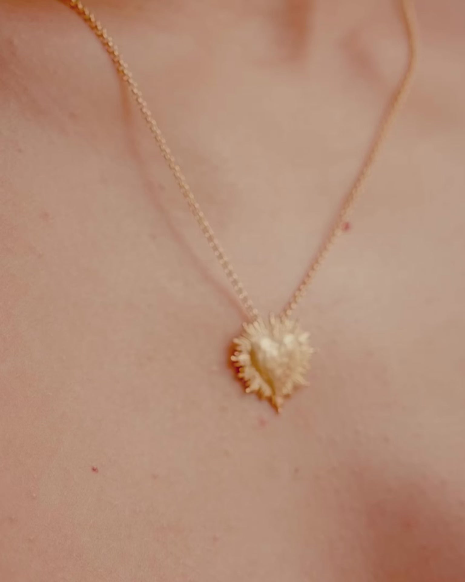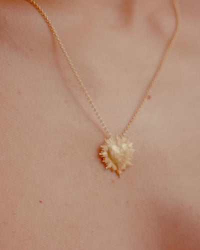 A radiant heart pendant necklace inspired by sacred Mexican iconography and ex-votos, with a hammered heart centerpiece and an intricate sunburst design.