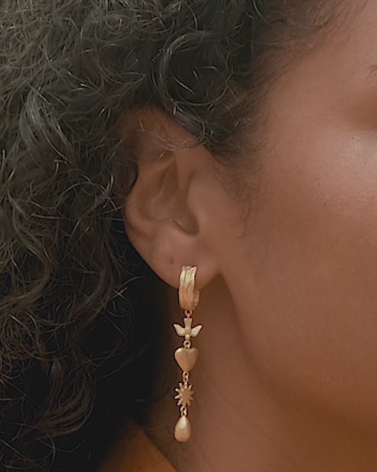 An ode to life’s magic and precious moments: a dove for peace, a heart for love, a sun and a drop for nature’s wonders. Discover the secrets to happiness with our Amara pendant earrings.