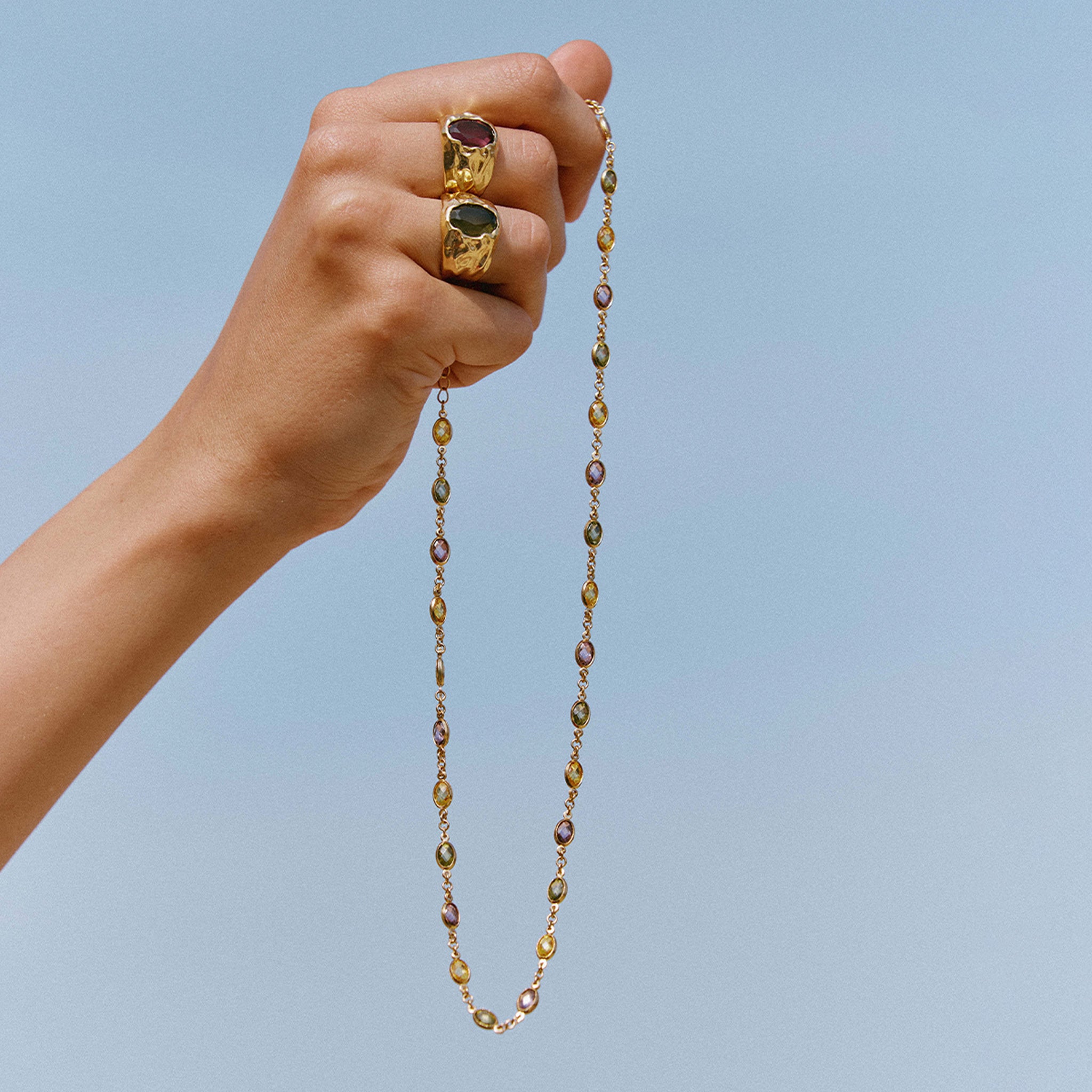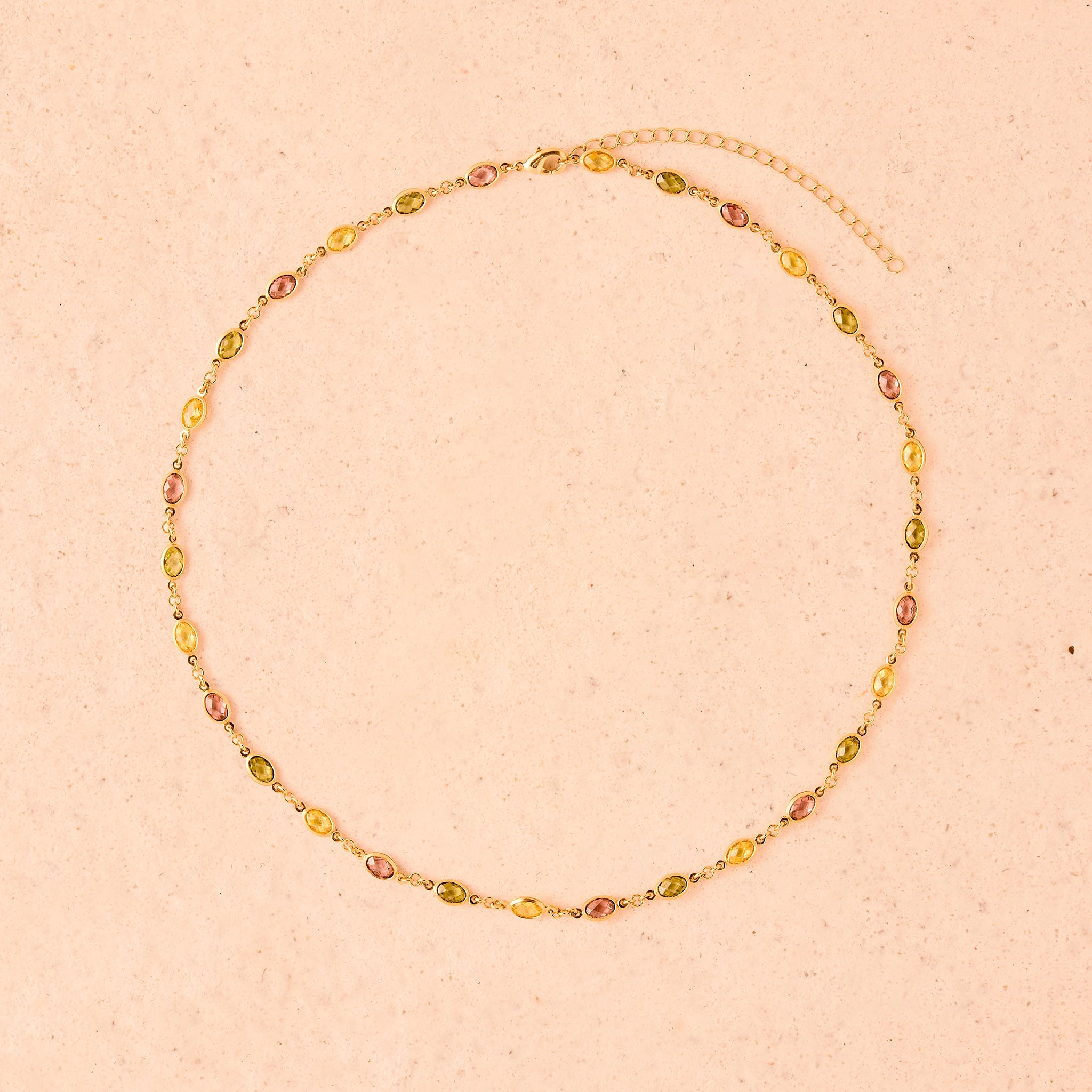 Alternating multicolored stones set on a fine chain, in vibrant shades of deep rosewood, golden yellow, and dark green.