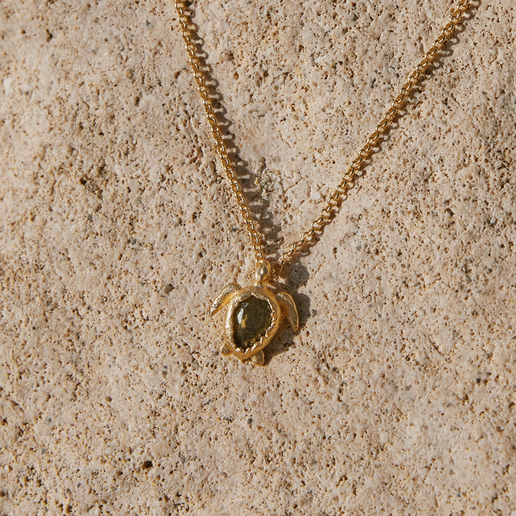 Lona is a small turtle pendant suspended from a thin rounded-link chain. At the center of the gold setting, a faceted dark green stone forms its shell. In ancient mythology, turtles symbolized luck, wisdom and longevity.